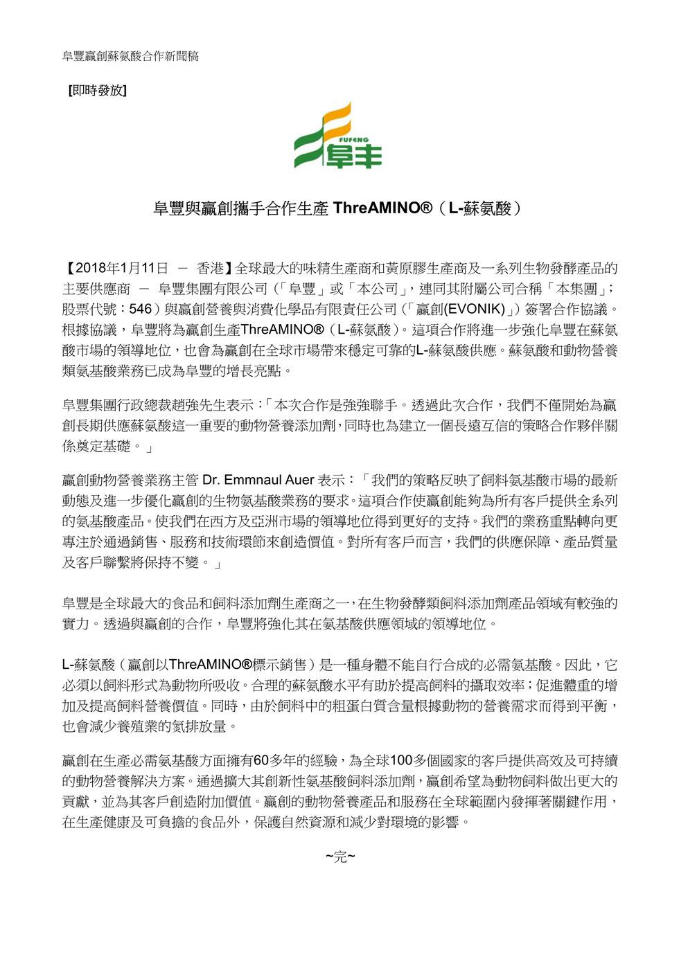 乐竟网页版入口-乐竟online(中国)与赢创携手合作生产ThreAMINO®(L-苏氨酸)